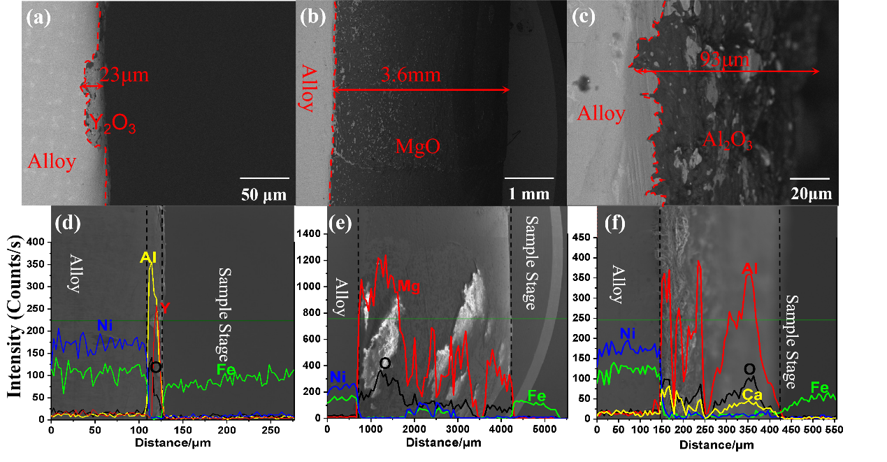 航空航天发动机被誉为工业皇冠上的明珠,是航空航天飞行器的心脏,其质量的优良直接决定了飞行器的性能,而发动机的质量很大程度上受制于材料的制造水平。镍基高温合金是航空航天飞行器发动机的关键材料,主要用来制造发动机中的燃烧室、涡轮盘、导向叶片、涡轮叶片等,其重量可占发动机总重量的30~40%。高洁净度的镍基高温合金液是制造高质量镍基高温合金产品的基本条件,在1400~1500℃的高温冶炼过程中,盛装合金液的耐火材料不可避免与合金液界面发生物理化学反应,影响合金液洁净度。研究团队研究了3种典型耐火材料:氧化钇、氧化镁、氧化铝与合金液的界面反应情况,多角度评价了三种耐火材料对合金液洁净度的影响,并分析了耐火材料与合金液界面反应机理,对于冶炼高洁净度镍基高温合金具有重要参考价值。