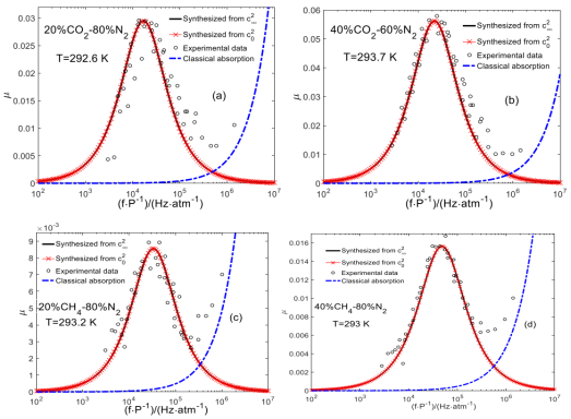 室温下不同比例N2-CO2和N2-CH4混合气体中由三频点声速值合成的声弛豫吸收谱与Ejakov实测数据(圆圈)的对比。实线:从高频声速平方的角度合成的声弛豫吸收谱;十字点线:从低频声速平方的角度合成的声弛豫吸收谱;点划线:经典吸收谱。 (a) 20%CO2-80%N2;(b) 40%CO2-60%N2;(c) 20%CH4-80%N2; (d) 40%CH4-60%N2。