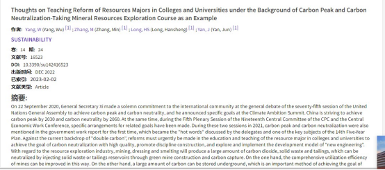 由资源与环境工程学院杨梧副教授为第一作者,龙汉生副教授为通信作者在国际期刊《sustainability》(SCI/SSCI双检索JCR2区,影响因子IF =3.889)上发表题为《Thoughts on Teaching Reform of Resources Majors in Colleges and Universities under the Background of Carbon Peak and Carbon Neutralization—Taking Mineral Resources Exploration Course as an Example》研究论文,并被Web of Science数据库检索。