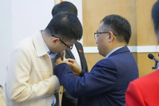 在2022年新进教师荣入仪式上,潘良明为新进教师逐一佩戴校徽,对他们加入学校大家庭表示诚挚欢迎,教学名师刘伟教授带领新进教师宣誓。新进教师代表韦超在会上作了发言。