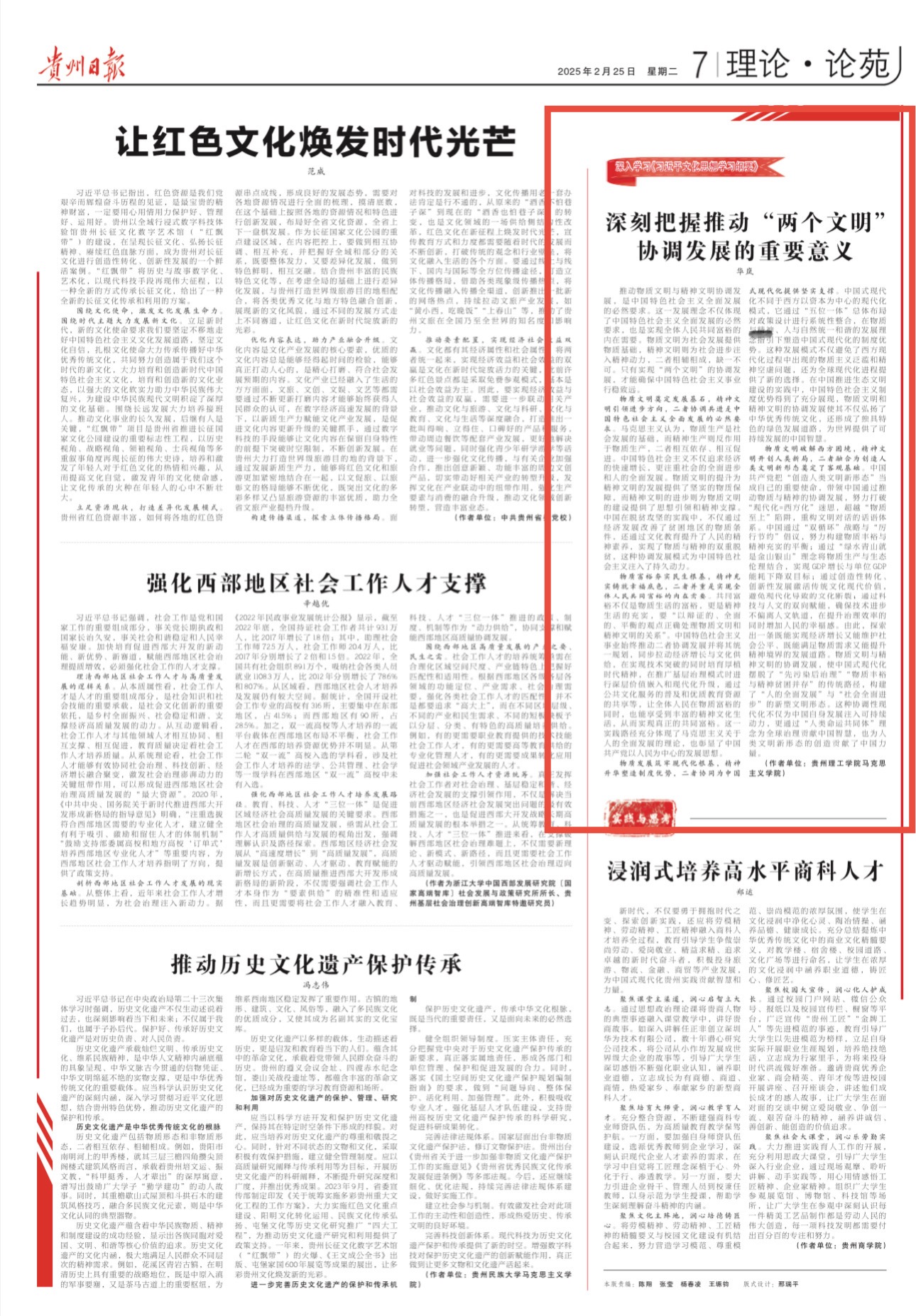 2月25日,《贵州日报》刊发马克思主义学院党总支书记华岚理论文章《深刻把握推动“两个文明”协调发展的重要意义》,全文如下: