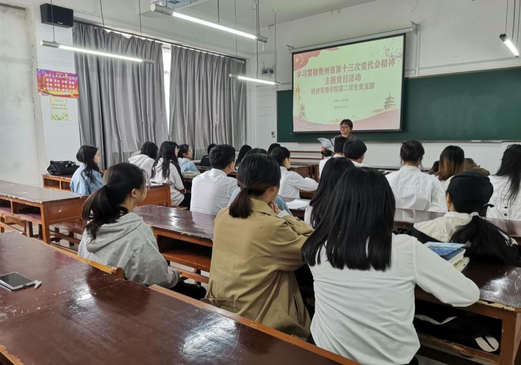 本网讯(经济管理学院 文图/向余)2022年5月16日,经济管理学院第二学生党支部在3教107教室开展主题党日活动,学习贯彻贵州省第十三次党代会精神。活动由支部书记刘艳辉主持,支部全体党员参加。