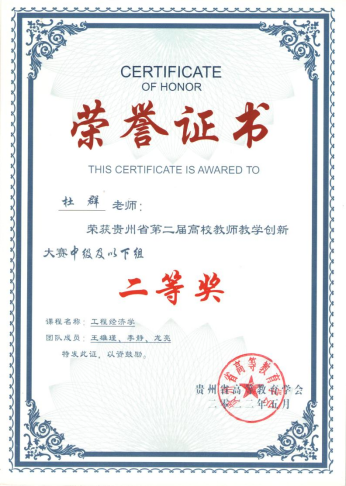 本网讯(经济管理学院 文图/金欣)近日,贵州省第二届高校教师教学创新大赛决赛结果公布,经济管理学院教师杜群及其领衔的《工程经济学》课程教学团队(团队成员:王雄瑾、李静、龙亮)在大赛中首创佳绩,荣获贵州省第二届高校教师教学创新大赛中级及以下组二等奖,实现了学院在省级教师教学竞赛中历史性的突破。