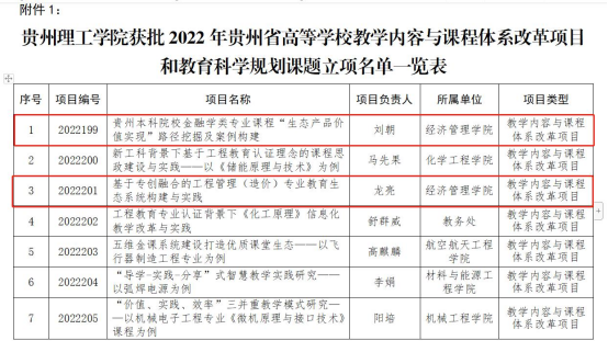 本网讯(经济管理学院 文图/金欣)近日,省教育厅公布了2022年贵州省高等学校教学内容与课程体系改革项目立项名单和2022年贵州省教育科学规划课题立项名单,经济管理学院刘朝老师申报的《贵州本科院校金融学类专业课程“生态产品价值实现”路径挖掘及案例构建》、龙亮老师申报的《基于专创融合的工程管理(造价)专业教育生态系统构建与实践》共2个项目获批教学内容与课程体系改革项目立项。