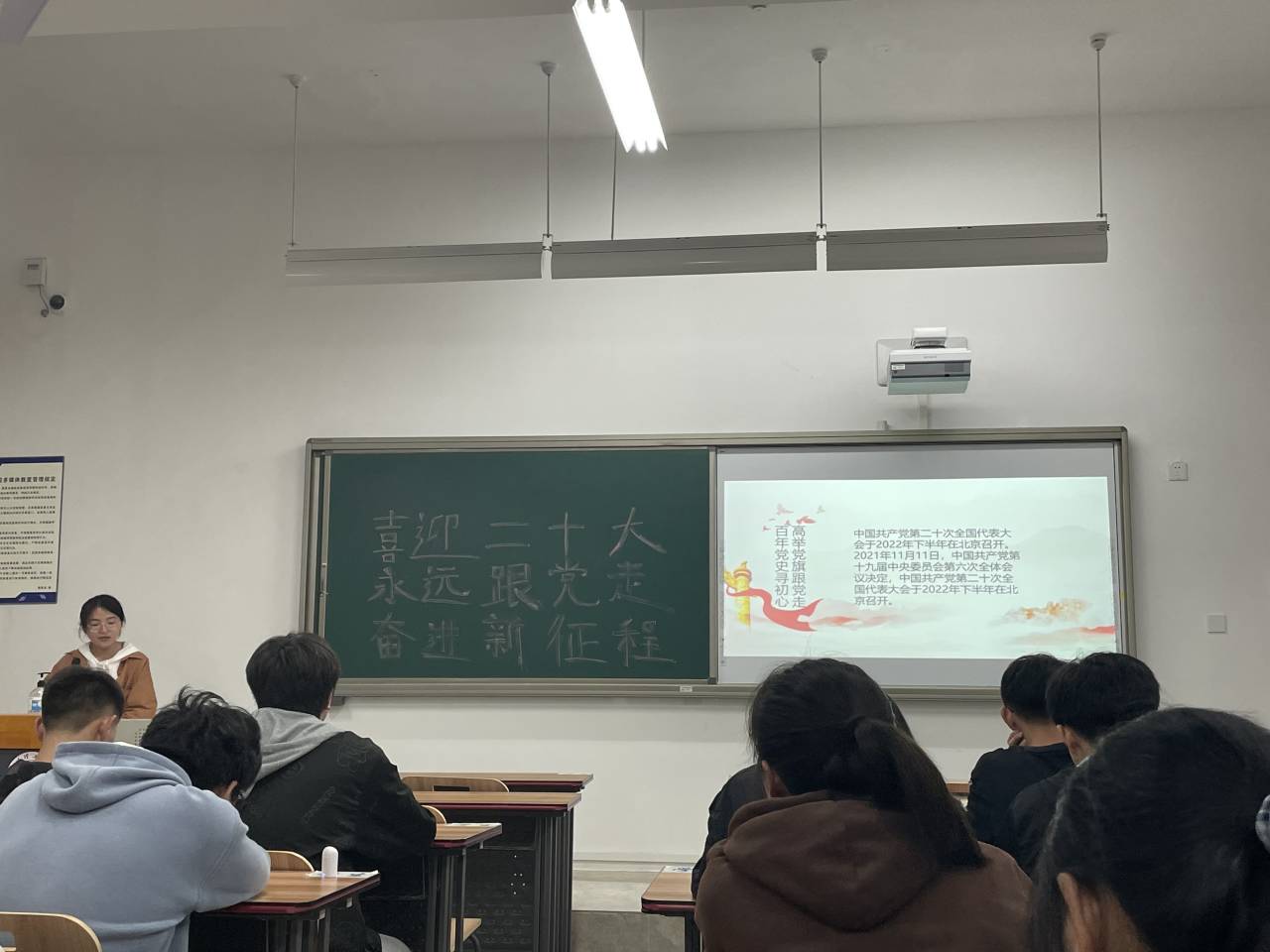 管科213班团支部李青青同学组织同学们进行“迎接二十大”的知识问答赛,并通过海报绘制、书写祝福语等形式表达对二十大的期待,支部同学参与度高,活动现场气氛活跃,整体效果好。