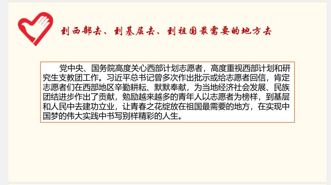 本次宣讲会旨在通过政策解读,帮助毕业生更好了解西部计划,积极投身西部建设,在祖国最需要的地方建功立业。