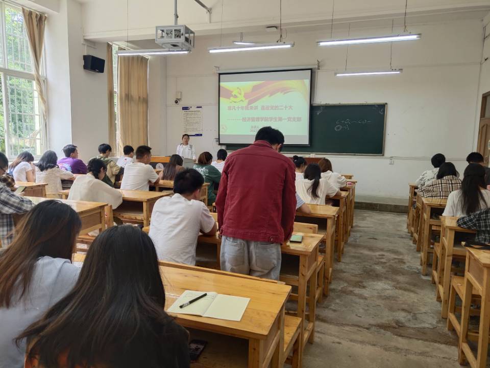 本网讯(经济管理学院 文/王莎 图/蔡兴荟)2022年6月15日中午,经济管理学院第一学生党支部在1104教室开展“非凡十年我来讲,喜迎党的二十大”主题党日活动,会议由支部书记白桂霞主持,党支部全体党员参加。
