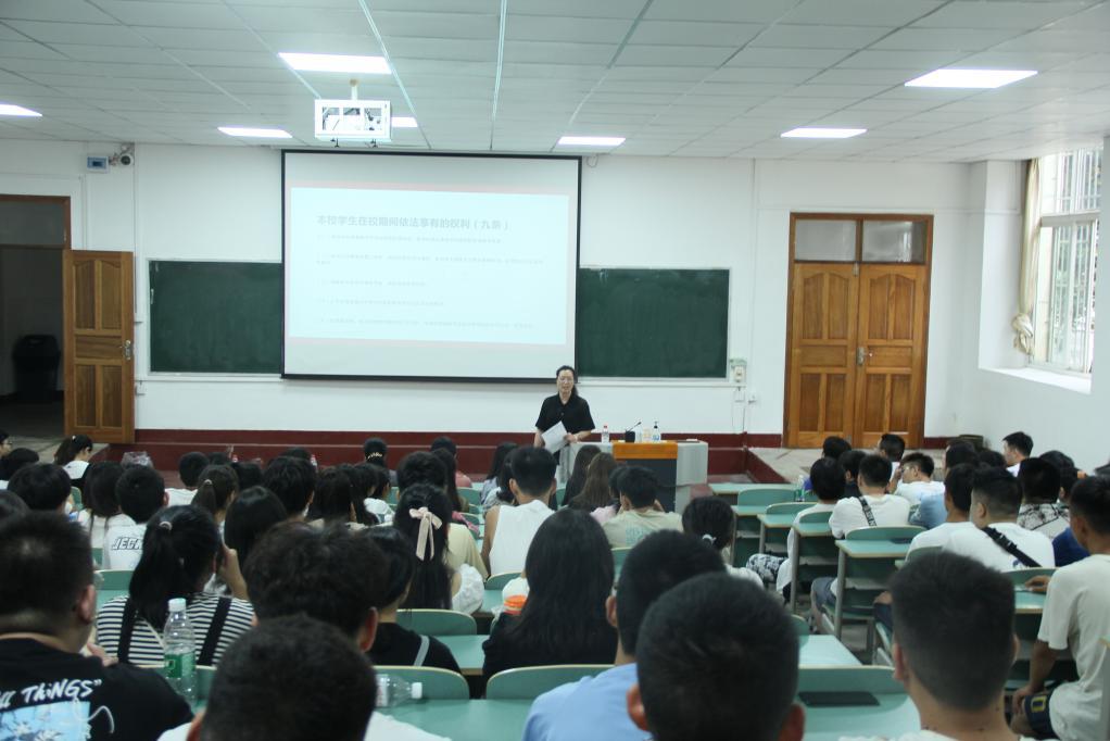 党总支副书记方燕为同学们详细解读《贵州理工学院学生手册》的重点内容,希望同学们守规矩,知敬畏,做新时代文明大学生;并通过鲜活的案例开展安全教育,鼓励同学们增强安全意识,筑牢安全防线,积极参与平安校园建设。