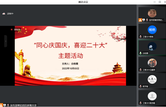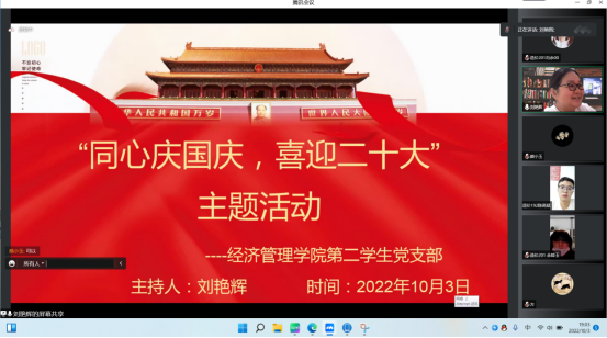第二学生党支部主题活动由支部书记刘艳辉主持,她组织党员观看了《建国大业》片段和国庆节当日升国旗仪式视频;介绍了国庆的演变史、国庆的意义与活动安排;领学了习近平总书记在庆祝中国共产党成立100周年大会上的重要讲话精神、《求是》杂志文章《习近平:新时代中国共产党的历史使命》。会上,吴应鑫、王岚、敖慧、金方念四名同志分享了自己的学习体会。