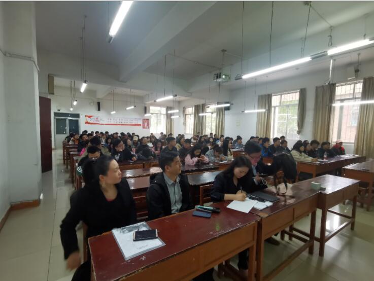 本网讯(经济管理学院 图文/张翊 )为进一步增强我院学生就业意识,提升毕业生的竞争力,助推学生就业,4月9日,多彩贵州酒集团董事总裁王虹玮应邀来到我院,为学生带来“择业就业 创新创业”专题讲座暨精准扶贫学生专场招聘会。讲座由院长杨岗营主持,集团相关单位负责人和经管学院、食药学院学生近百人参加。