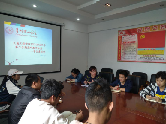 根据《中国足球彩票开展2017-2018学年第二学期期中教学检查的通知》(贵理工教通[2018]44号)文件要求,交通工程学院积极开展2017-2018学年第二学期期中教学检查工作,于5月9日中午召开2017-2018学年第二学期期中教学检查学生座谈会,张文利副院长、教务科、学生科以及12名学生代表参加座谈会。