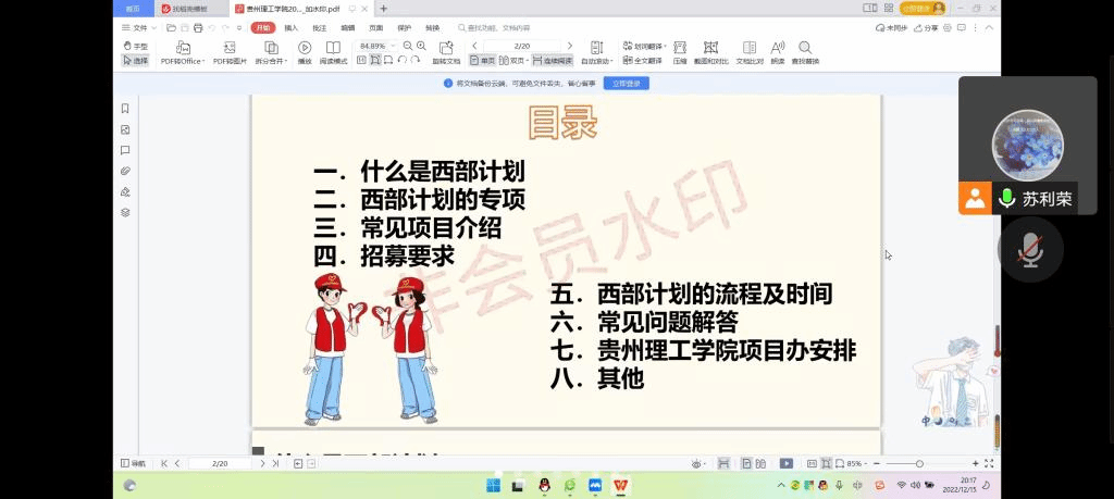 在会议中,苏利荣从什么是西部计划、西部计划专项、招募要求、流程及时间等八个方面全面介绍西部计划的主要内容。西部计划专项分为国家专项和地方专项两大类,涉及7个服务项目,但是针对贵州理工学院只涉及基层青年工作、基层社会管理和服务新疆三个项目。她还针对乡村教育、乡村建设、服务新疆、医疗护理以及西部计划报名条件与流程、基本政策与保障,岗位分配,服务期满后的优惠保障政策等相关内容进行了讲述。
