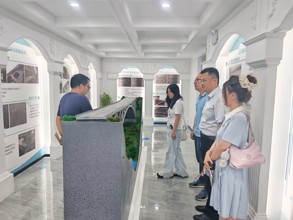 在公司负责人的陪同下,黄政副院长一行参观了实训基地、山区公路桥梁病害警示中心。实训基地包含了地基、基桩、支挡结构、桥梁、隧道等各种实体项目,山区公路桥梁病害警示中心包含了桥梁可能面临的各种病害、对应的检测方法、养护手段及现在大力推行的桥梁健康监测方式等。