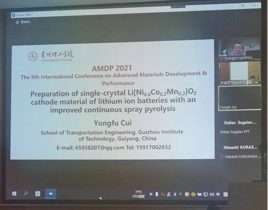 贵州理工学院交通工程学院教师崔永福老师受邀参加此次学术会议,组委会原计划安排崔老师作为分会主席主持分组讨论,但由于疫情突发未能到会议现场,只能在线上作了“Preparation of single-crystal Li[Ni0.6Co0.2Mn0.2]O2 cathode material of lithium ion batteries with an improved continuous spray pyrolysis”为主题的报告。