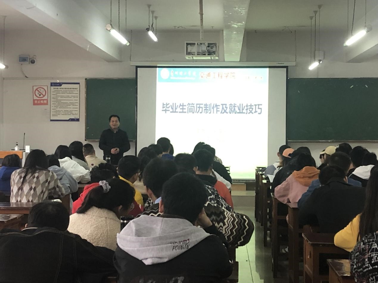 (本网讯交通工程学院图文/帅祥俊)为做好毕业生就业工作,加强对毕业生就业的指导与帮助,提升我院毕业生的就业意识和就业能力,11月2日下午,交通工程学院专任教师邹俊辉面向交通183、184同学开展“毕业生简历制作及就业技巧”专题讲座。
