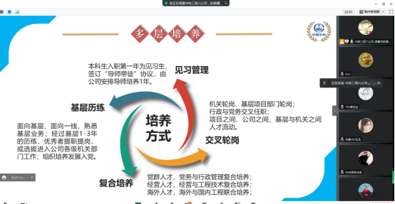 本网讯(交通工程学院 图/文 余何彪)为进一步提高就业服务水平,为用人单位和我院毕业生搭建交流平台。11月2日14点,学院通过腾讯会议举办了中铁二十局集团第一工程有限公司交通工程学院2023届毕业生线上专场招聘会。中铁二十局集团第一工程有限公司,是国资委下属“世界500强企业”中国铁建股份有限公司的全资三级子公司。目前拥有公路工程总承包特级资质,市政公用工程、建筑工程等总承包壹级资质,铁路工程总承包贰级资质;公路路基、公路路面、桥梁工程、隧道工程、地基基础工程等5项专业承包壹级资质。