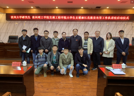 2018年11月5日,交通工程学院党总支书记李学明,学院副院长陈筠,与贵州省麻江县共同搭建校县合作平台,积极组建贵州理工学院大学生支援麻江县脱贫攻坚工作队,工作队员将在麻江县农村安全住房和“三改”工程及人居环境综合整治工作中发挥积极作用,旨在建立一批服务“三农”的产业项目,更好发挥高校专业技术水平,助推麻江县脱贫攻坚工作贡献扶贫力量。