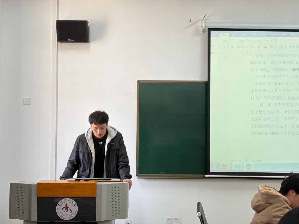 学习完学生干部培训学习资料后,学生会主席团成员陈路瑶对20242025学年学生会工作做出总结。他总结在本学年学生会成功举办的活动以及各部门的工作完成情况,与此同时提出了在工作中的不足及接下来的工作的期望。