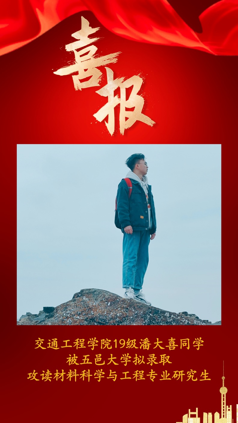 本网讯(交通工程学院 图文/潘大喜)交通工程学院2023届考研学子捷报传来,在2023年全国硕士研究生招生考试中,交通191班潘大喜同学拟录取五邑大学,特发中国足球彩票:以示祝贺!