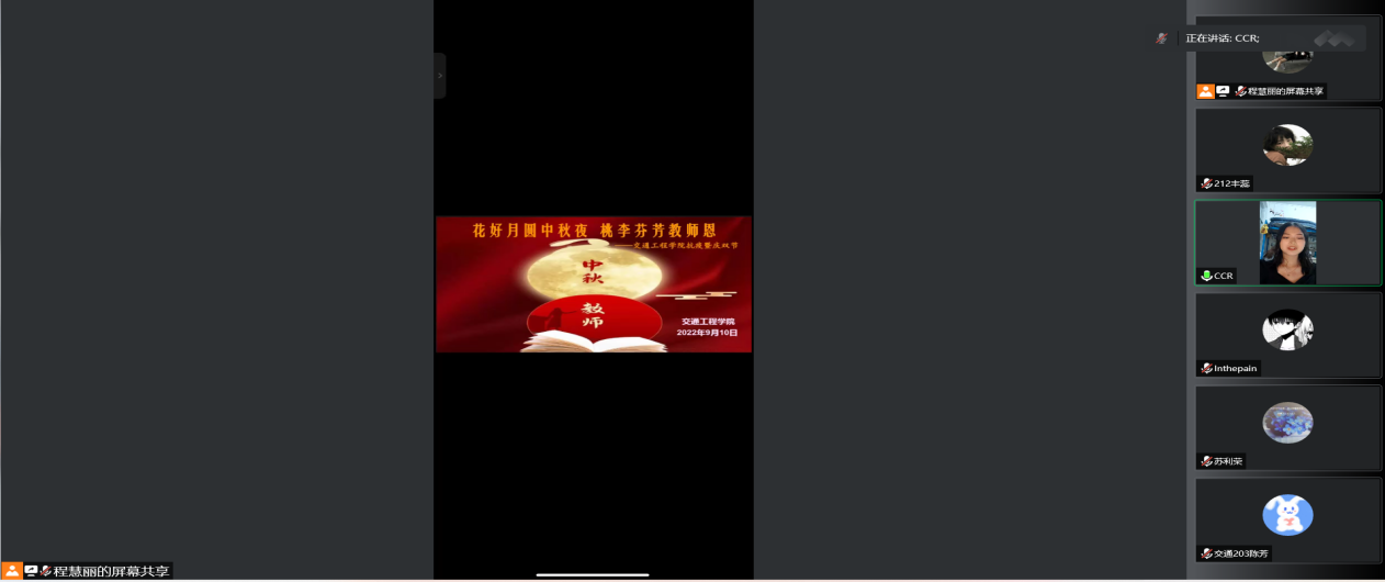 本网讯(交通工程学院 图文/丰蕊)中秋教师节双节喜相逢,人圆月圆齐团圆,双节齐贺共欢乐,桃李满园正当时。9月10日,我们迎来了中华民族的传统节日中秋节和第38个教师节,但当前贵阳疫情形势依然十分严峻,在这个特殊的节日期间,为增加中秋气息,活跃节日氛围,慰问交通学院师生,节日当天交通工程学院开展线上抗疫暨庆双节晚会,学院全体师生共同参与。