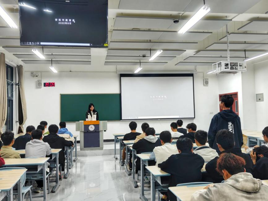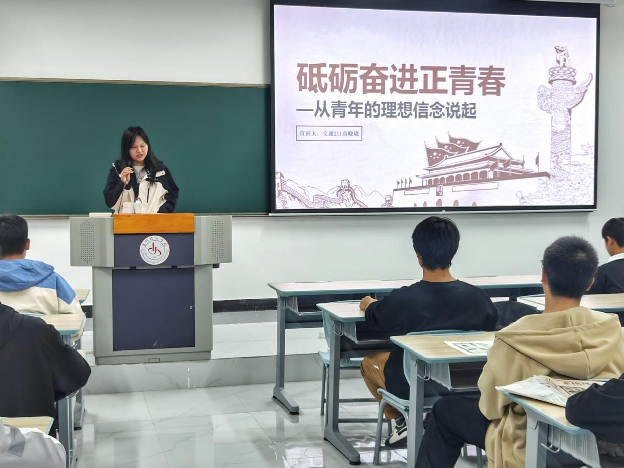 2023年10月25日,交通工程学院大学生宣讲团成员高晓晓在B01教学楼502教室,开展以“砥砺奋进正青春—从青年的理想信念说起”为主题的宣讲活动,建筑231班、建筑232班全体同学参加。