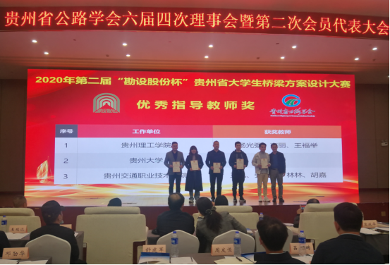 最后,交通工程学院杨光强、王福举、高丽三位老师荣获优秀指导老师奖,由贵州省公路建设养护集团有限公司总工程师熊延华为获奖老师颁发了奖状。