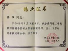在辅导员专业化、职业化、专业技能等建设上,我院辅导员梁维老师及三位班主任于2016年9月参加了贵州理工学院第四期辅导员班主任培训班,培训过程主要围绕大学生思想政治教育理论基础、大学生心理健康教育、心理危机的预防与识别、学籍管理、资助政策、易班的使用等方面进行了学习。2016年12月由信息、机械、交通学院在一号公寓先锋党员活动室承办贵州理工学院2016~2017学年第一学期第二期辅导员沙龙。完成了贵州理工学院276名学业预警学生学习动力的调研并完成了调研报告,报告针对学生的学习动机、学习兴趣和学习态度进行了具体、深刻的分析。同时2016年12月参加贵州理工学院第二届辅导员职业能力大赛。通过上述活动,我院辅导员和班主任在专业技能上都得到了锻炼和一定的提高。