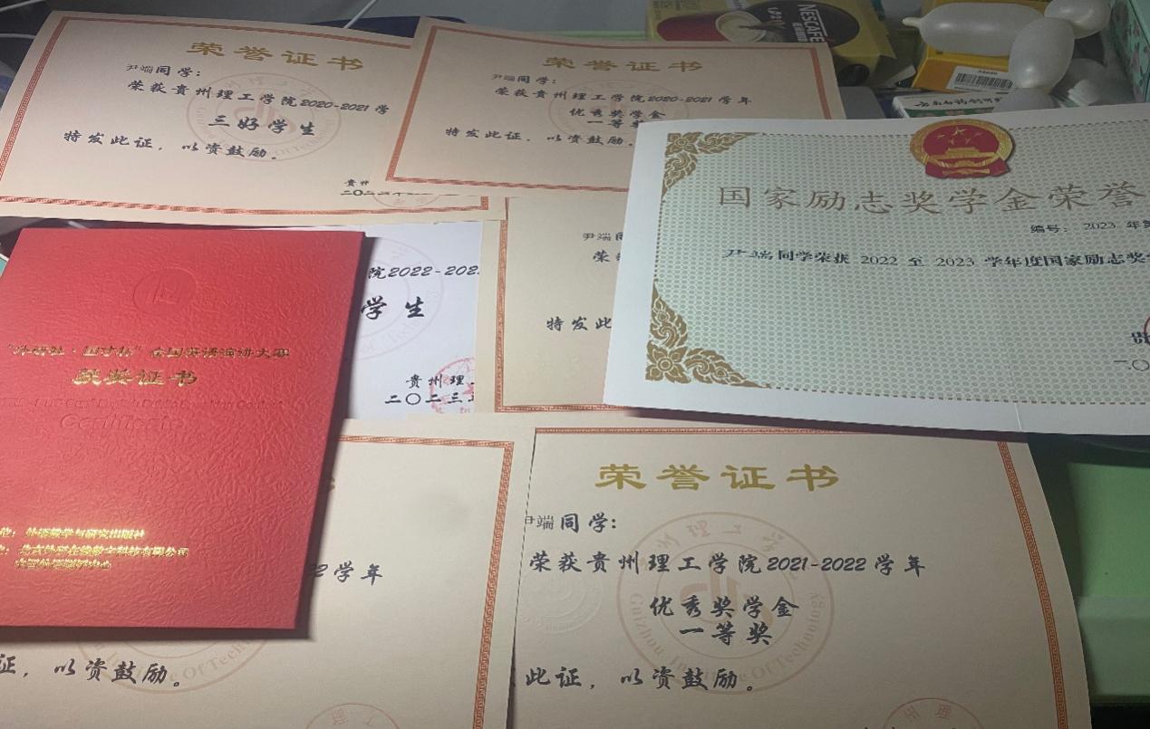 每当有人谈起尹端时,首先想到的就是他出色的成绩。在校期间,他的加权平均成绩和综合测评成绩每年都是班级第一,曾获得省级国家励志奖学金一次,校级优秀毕业生一次,校级一等奖学金两次,校级三好学生三次,以及通过全国大学生英语六级考试,他还以优异的成绩获得贵州省普通高等学校优秀毕业生。他认为:“学习如逆水行舟,不进则退”。