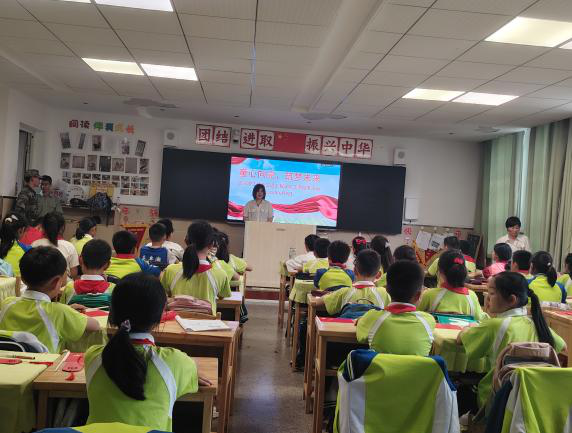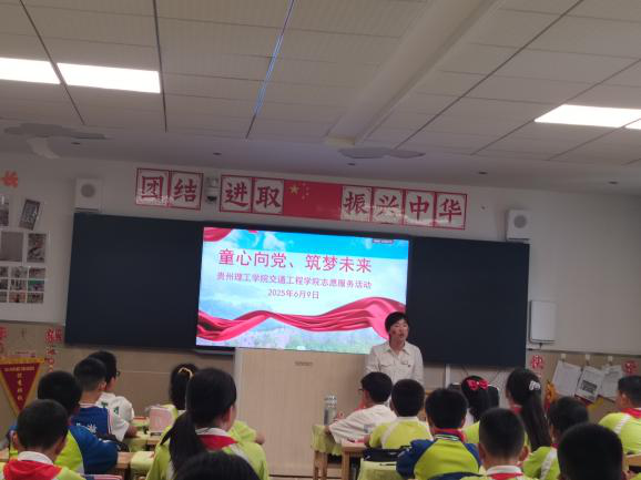 (本网讯 交通工程学院 图文/彭玉林)为深入贯彻落实党的教育方针,引导青少年坚定理想信念,厚植家国情怀,6月9日下午,交通工程学院学生党支部组织5名学生党员和2名退役军人,在支部书记苏利荣的带领下走进贵州师范大学贵安附属小学五(6)班,开展以“童心向党,筑梦未来 红色教育润童心”为主题的志愿者服务活动,为附小的同学们带来了一场别开生面的红色教育课。