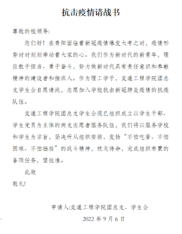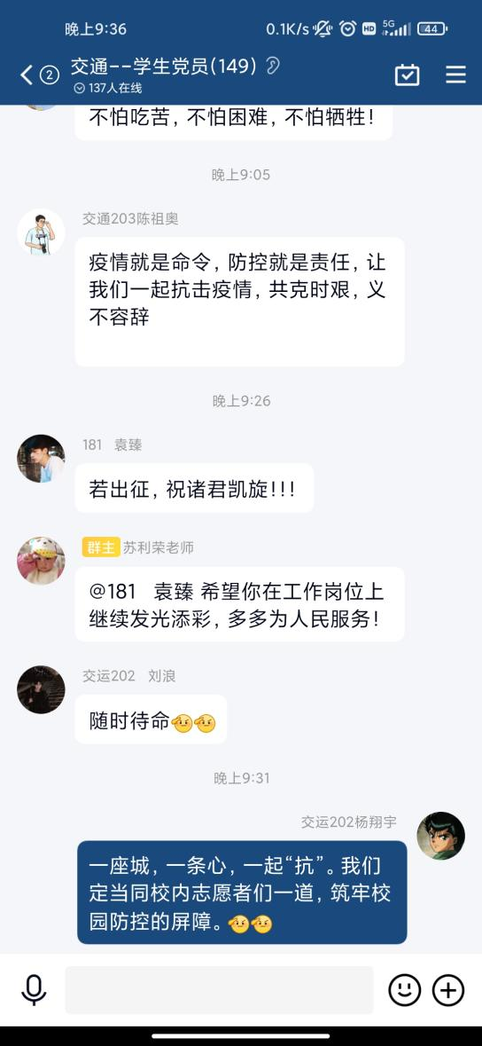 会前,交通工程学院学生以学院团总支、学生会名义向校学工部、校团委提交了“抗击疫情请战书”。周伟结合参与蔡家关校区抗疫一线的工作提出要求和希望:“抗击疫情请战书”彰显了交通青年学子勇于担责、敢于奉献的向上品格,希望同学们要在枕戈待命随时参与抗击疫情的工作中真正得到锤炼,要将思政课程和课程思政中的所学转化为抗疫行动中的力量,在配合学校抗疫工作中主动思考、主动作为,快速成长。同时,在抗疫期间的日常学习生活中,不断加强自律,带头做好表率,用正确的思想引导积极的行动,以榜样的作用营造向上的氛围,充分发挥在广大青年学生中的旗帜作用。