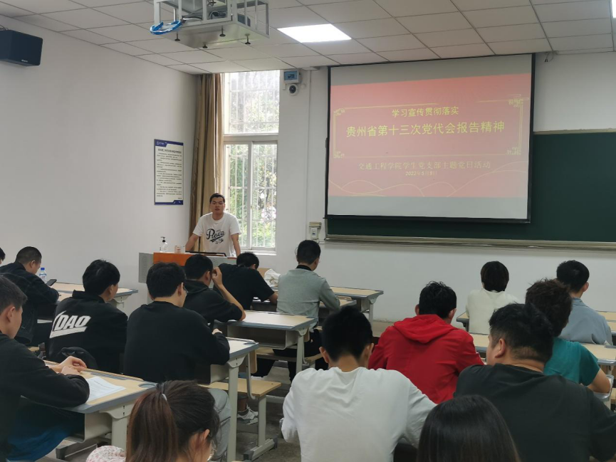 本网讯(交通工程学院 图/文苏利荣)为深入学习贯彻省第十三次党代会精神,交通工程学院学生党支部组织全体学生党员于2022年5月9日在2-101教室开展“学习贯彻省第十三次党代会精神”主题党日活动。活动由支部书记苏利荣同志主持,宣传委员高键及学院全体学生党员参加。