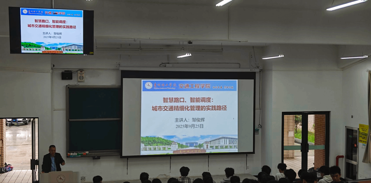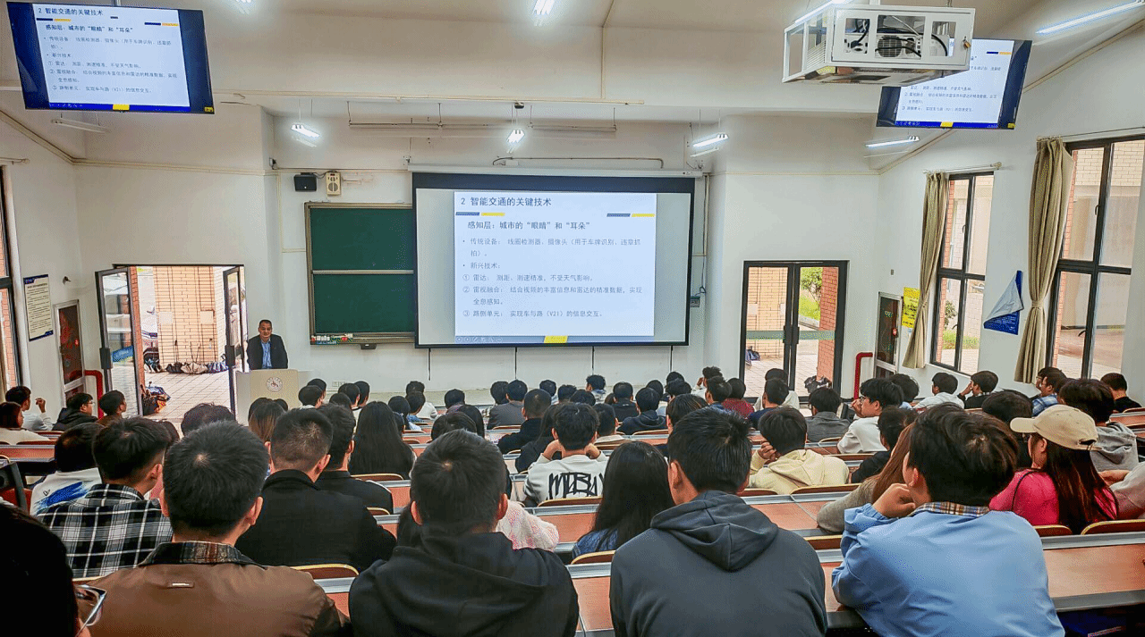讲座围绕智能交通系统的定义、核心目标及关键技术展开,重点讲解了“智慧路口”作为城市交通的“智能神经元”如何实现实时感知与动态优化,以及“智能调度”作为“协同指挥官”如何提升整个交通网络的运行效率。邹俊辉还结合国家“交通强国”战略,介绍了车路协同、数字孪生等前沿技术应用,并为同学们提供了进入智能交通领域的学习路径与职业发展建议。