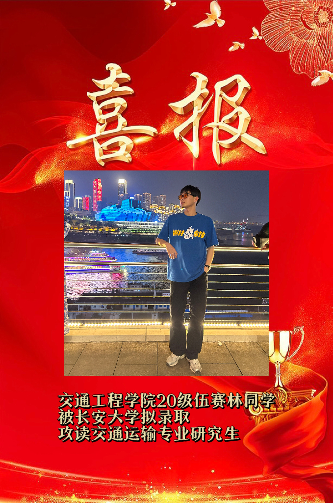 交通工程学院2024届考研学子捷报传来,在2024年全国硕士研究生招生考试中,交通202班伍赛林同学拟录取长安大学,特发中国足球彩票:以示祝贺!