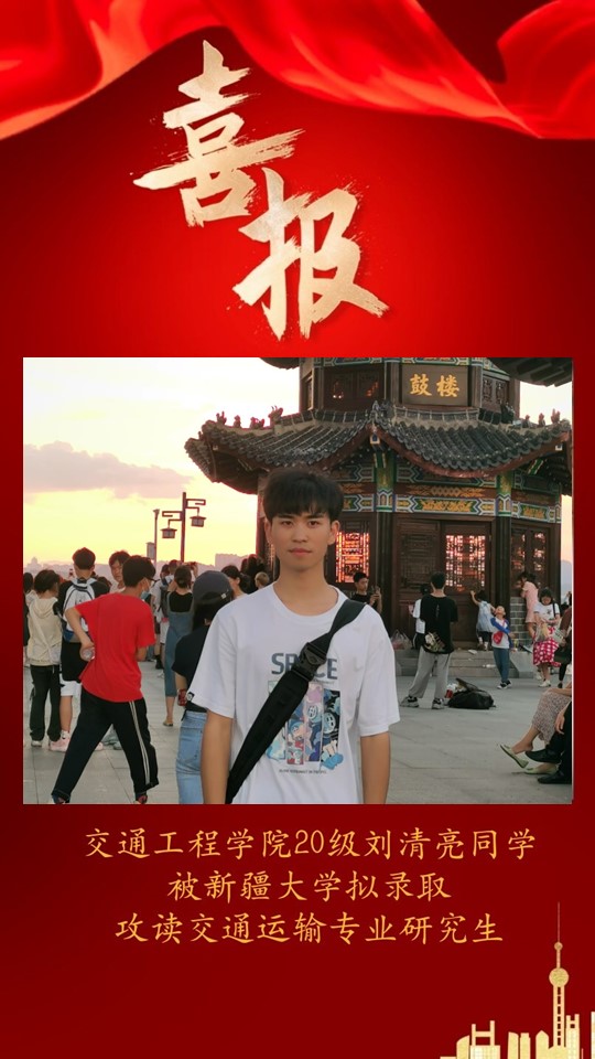 交通工程学院2024届考研学子捷报传来,在2024年全国硕士研究生招生考试中,交通203班刘清亮同学拟录取新疆大学,特发中国足球彩票:以示祝贺!