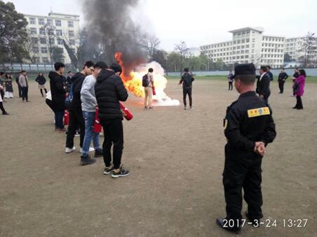 面对熊熊燃烧的火堆,学生们表现的十分沉着,熟练地按照灭火的步骤和方法,将汽油燃起的浓烟大火成功的迅速扑灭,做到了冷静沉着的面对突发现象,成功快速的扑灭大火的消防标准。