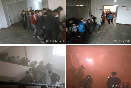 随后同学们到教室内坐好,模拟晚自习时正在学习的情景,十几分钟后随着报警声的响起,同学们用毛巾捂住口鼻有序的撤出教室,并按照逃生演练方案设定的逃生路线迅速而有序的逃离到指定位置,保卫处老师们也及时赶到,进行救援行动,学生在演练期间没有出现拥挤,踩踏等安全事故。
