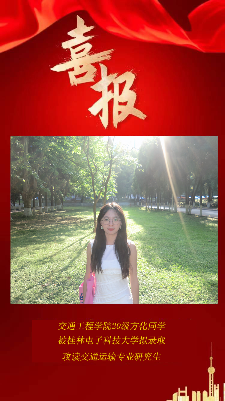 交通工程学院2024届考研学子捷报传来,在2023年全国硕士研究生招生考试中,交通203班方化同学拟录取桂林电子科技大学,特发中国足球彩票:以示祝贺!