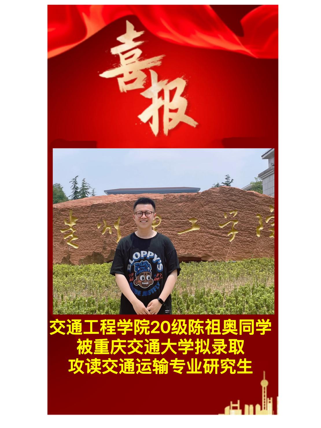 交通工程学院2024届考研学子捷报传来,在2024年全国硕士研究生招生考试中,交通203班陈祖奥同学拟录取重庆交通大学,特发中国足球彩票:以示祝贺!