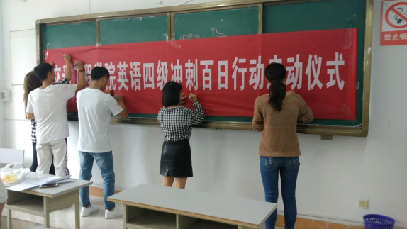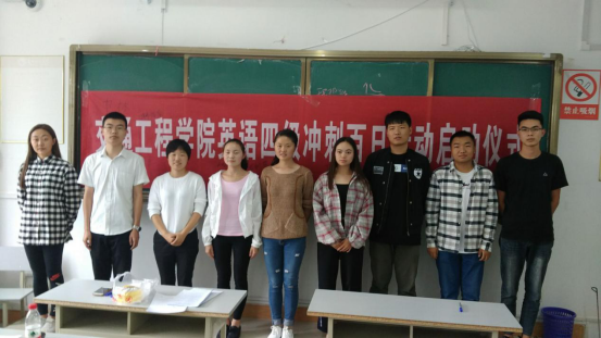 本网讯(交通工程学院 苏利荣)为帮助同学们提高英语四级考试成绩,尽快过级,学院聘请专业英语老师开设英语四级培训班,9月7日下午14点,交通学院英语四级冲刺百日行动正式启动,李学明书记、苏利荣老师、周谦老师及全体培训班学员参加启动仪式。