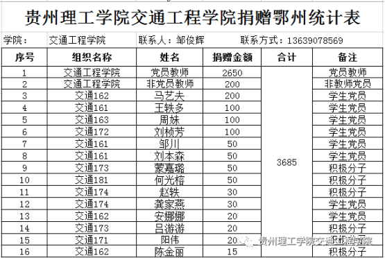 为响应习近平总书记和党中央、省委对广大党员的号召,2月28日晚上20:00,交通工程学院党总支组织召开师生党员支持新冠肺炎疫情防控工作捐款视频会议,学院党总支书记李学明宣读《中共贵州理工学院委员会贵州理工学院支持新冠肺炎疫情防控工作捐款倡议书》,号召广大党员提高政治站位,发挥党员先锋模范作用,同心协力凝聚起众志成城、共克时艰的强大力量,支持新冠肺炎疫情防控工作,截止3月1日,学院师生党员捐款3685元。另在前期校学生会青春“战役”募捐活动中,交通学子积极响应号召参与募捐,向湖北抗疫伸出援手,各班级共计捐款4838.28元。通过此两次募捐活动,交通工程学院师生共为新冠肺炎疫情防控捐款8523.28元。