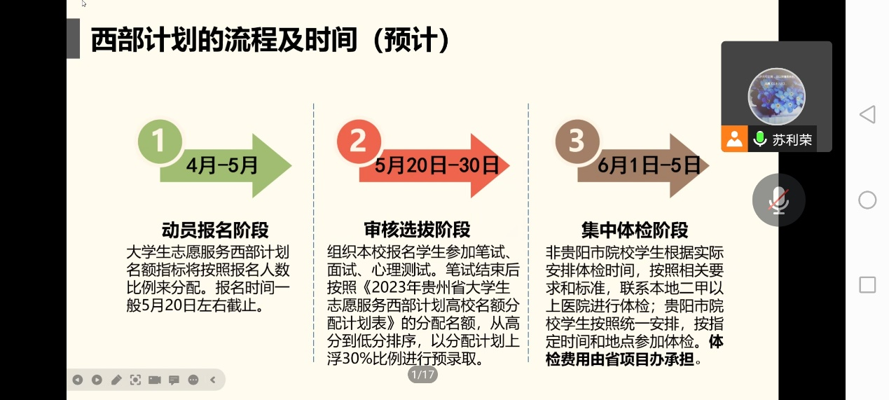 本网讯(交通工程学院 图文/王海林)“到西部去,到基层去,到祖国最需要的地方去。”为弘扬志愿精神,进一步做好大学生志愿服务西部计划工作,帮助我院2019级同学了解西部计划,积极投身西部建设,2023年4月11日晚19点,交通工程学院团总支通过腾讯会议召开西部计划宣讲会。此次宣讲会由交通工程学院团总支书记苏利荣主讲,2019级全体同学参与。
