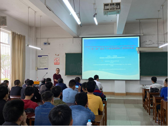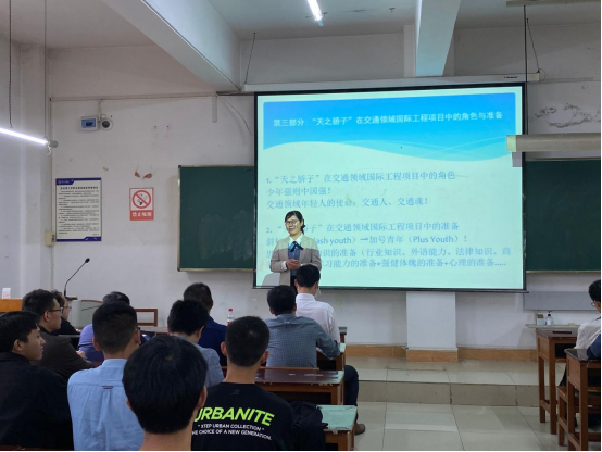 随后,石连富为在场师生做了本次讲座。讲座的主要内容包括:“一带一路”倡议下交通领域中资企业“走出去”战略,国际交通领域工程项目实施要点,交通工程专业学生在国际交通领域中的角色与准备。在讲座中,石连富引用了大量交通领域海外工程实施案例,深入浅出地讲解了“一带一路”倡议下交通领域工程项目实施的背景及关键。