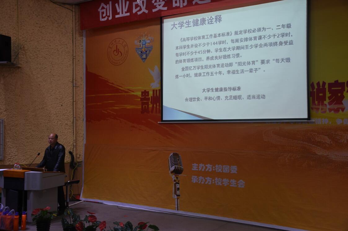 其次,体教部高徐部长作了重要讲话。就大学生健康生活的诠释、体育对大学生形成健康生活方式的意义、运动的益处、运动的注意事项、常见运动损伤处理及积极锻炼鼓励措施等方面发表讲话。