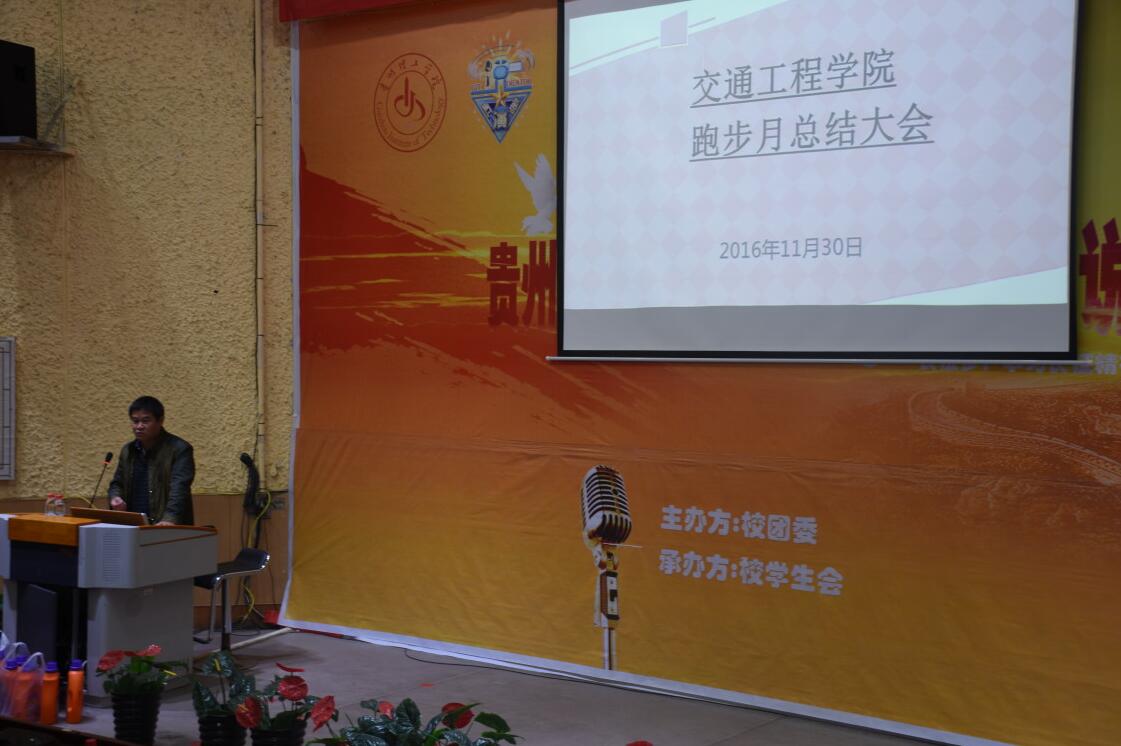 首先,学生会副主席杨鑫介绍跑步月活动的完成情况,对本次跑步月成果进行了汇报,随后学生代表施孟、魏琪分享了跑步心得,缪志农院长宣读了“贵理工交通发[2016]4号《中国足球彩票表彰交通工程学院“跑步月”活动中先进个人和集体的决定》”,宣读获表彰的同学及寝室名单,希望获表彰的同学再接再厉,未获表彰的同学后发赶超,形成交通工程学院良好的健身氛围。