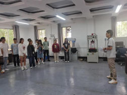 在道路工程实验室。王琪和葛鹏两位老师从实验室建设规划,仪器设备种类、功能,主要承担的课程等方面向学生进行介绍。介绍的过程中同学们兴趣浓厚,不少同学针对沥青混合料拌和仪、轮碾仪等设备进行提问,王琪逐一进行解答。
