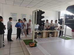 在交通管理与控制实验室。葛鹏向同学们介绍了该实验室的信号交叉口模型、智能物联网实验箱及配套软件。同学们兴趣十分浓厚,不满足于静态展示,于是由老师现场开机演示,满足大家好奇心同时进一步激发了同学们对专业课的兴趣。