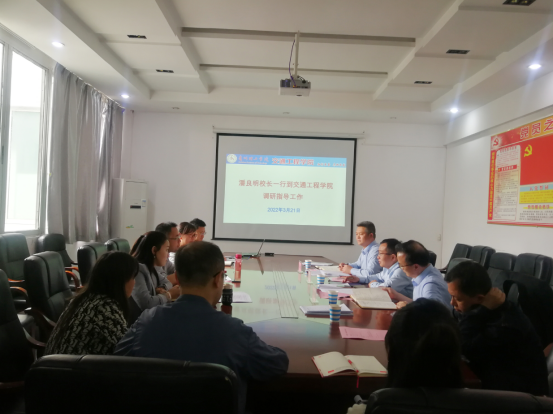 本网讯(交通工程学院 图/文 邹俊辉)2022年3月21日下午,校长潘良明、副校长张开智一行到交通工程学院调研指导工作。发展规划与对外合作处负责人及学院办公室相关人员陪同调研。