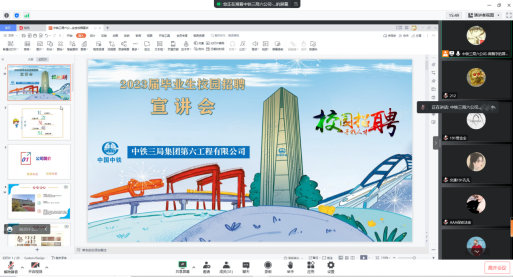 本网讯(交通工程学院 图/文 余何彪)为避免人群集聚带来的潜在风险,同步做好新冠肺炎疫情防控和企业招聘、就业服务保障工作,11月1日19点,学院通过腾讯会议举办了中铁三局集团第六工程有限公司交通工程学院2023届毕业生线上专场招聘会。该公司人力资源部负责人对我院学生高度评价和肯定,希望我院优秀同学能前往单位就业,同时也勉励大家继续发扬“吃苦耐劳、扎根基层”的工匠人精神。