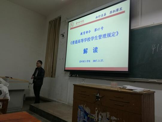 班主任邹俊辉老师对于学习《新规定》进行了详细的解读。邹老师在发言中说,新《规定》包括七章六十八条,涉及学生的权利与义务、学籍管理、校园秩序与课外活动、奖励与处分、学生申诉五大方面,充分体现了以学生为本的思想,强化了学生的主体地位;对老师的教学水平提出了更高的要求,有利于推动老师进一步加强施教能力建设;对高校的学生管理工作和广大学生工作者的业务素养提出了新的期待;为高校学生管理和服务工作指明了方向和目标。邹老师也详细介绍了《新规定》的特点:一是突出高校立德树人根本要求;二是为学生创新创业提供制度支持;三是更加注重保护学生权益;四是促进学生自我管理;五是推进高校依法治校。