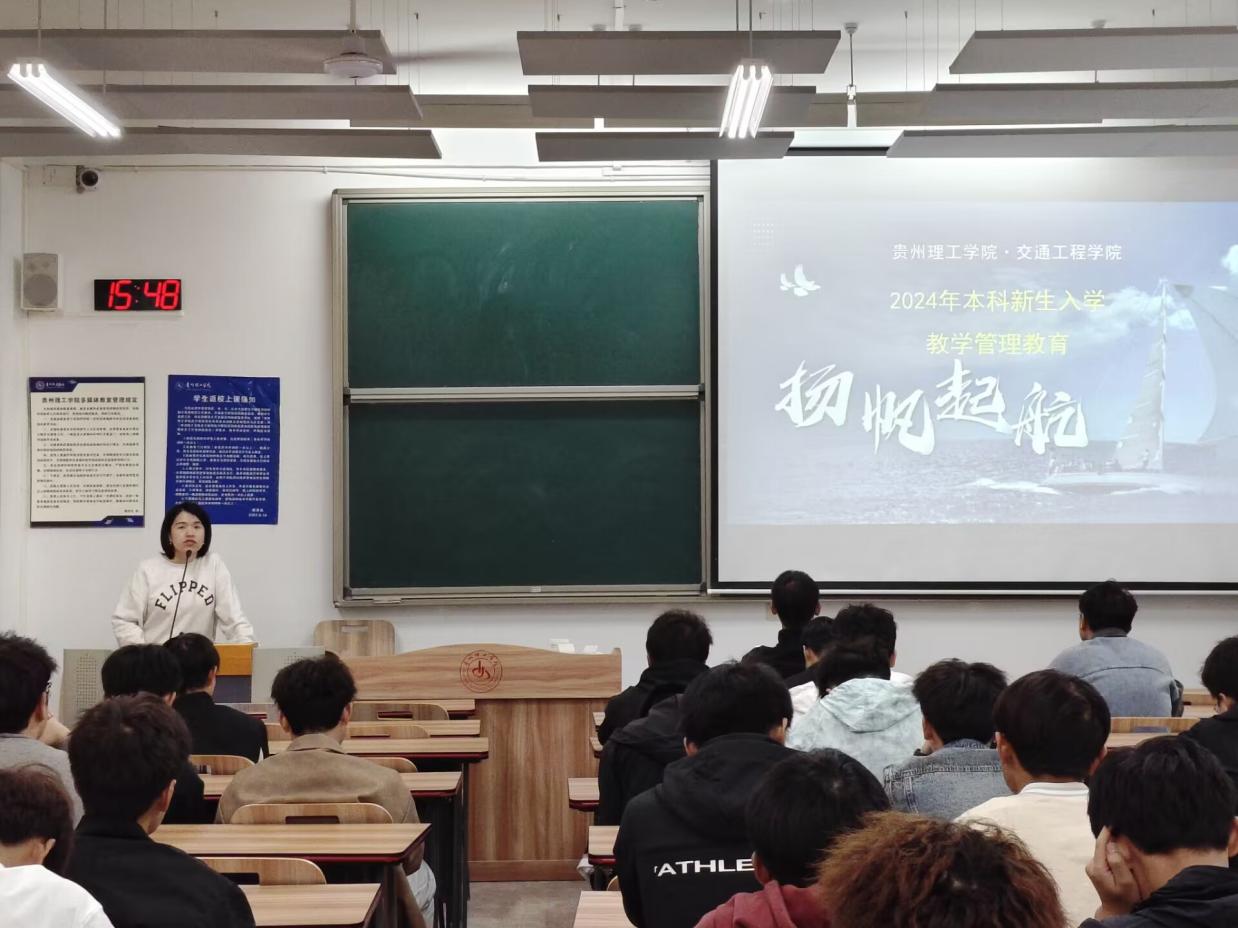 (本网讯 交通工程学院 图文/沈冬冬)为帮助2024级新生更好地适应大学生活,明确学习目标和未来职业规划,2024年10月31日下午,交通工程学院教务科陆艺老师分别在开物楼G1216教室和G1217教室,为交通241班、交通242班及交运241班举行了以贵州理工学院学生学籍管理规定为主题的专题讲座。